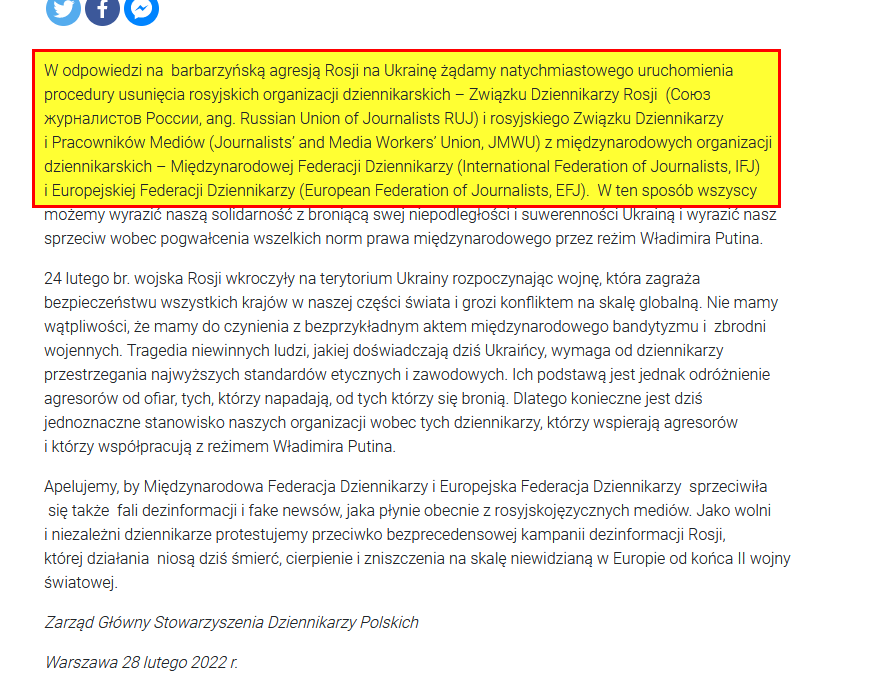 - JMWU mocno popiera ruch antywojenny w Rosji i wspiera nasze afiliowane organizacje ukraińskie NUJU i IMTUU; nie rozumiem dlaczego SDP oskarża organizację, która z determinacją wspiera naszych kolegów w Ukrainie? Czy konsultowaliście sprawę Waszego apelu z NUJU i IMTUU przed jego napisaniem? Jestem pewien, że przywódcy naszych afiliowanych organizacji w Ukrainie bardzo mocno sprzeciwią się jakimkolwiek krokom przeciw JMWU.